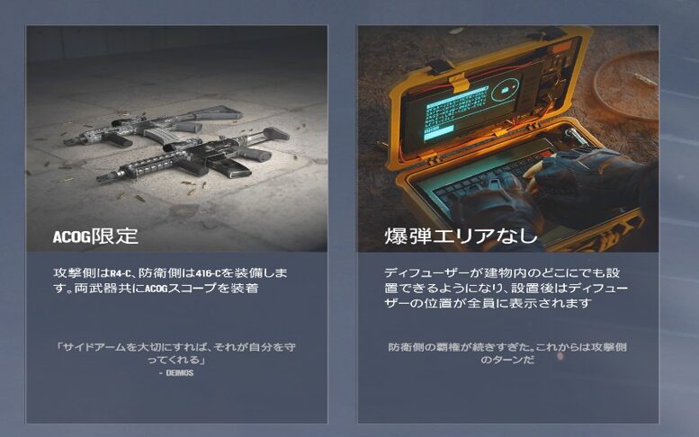 ACOG限定では防衛側は全員がJagerの武器416-CとSMG11にACOGを装着した状態で戦い、攻撃ではASHの武器R4-CのACOGを全員が所持させられることとなる。まるでY1の頃を思い出させてくれるユニークなゲームモードでした。