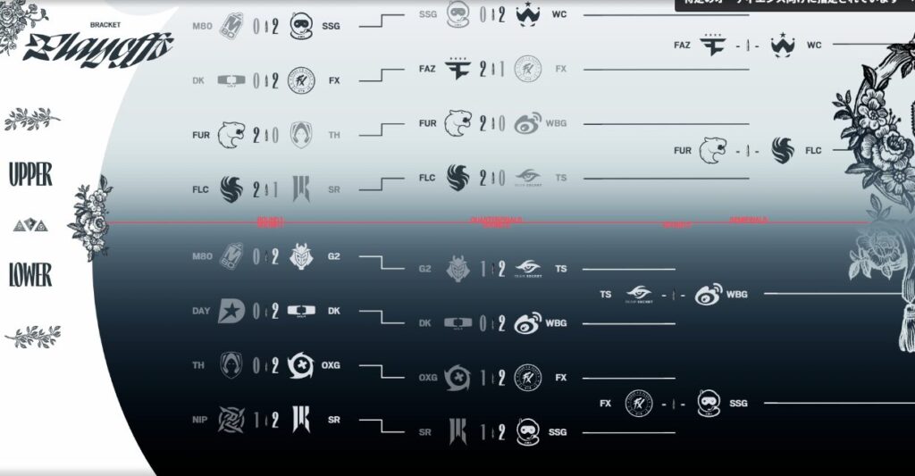 プレイオフDay 2ではLower BracketのRound1,2が始まり、ベスト8までのチームが確定しました。