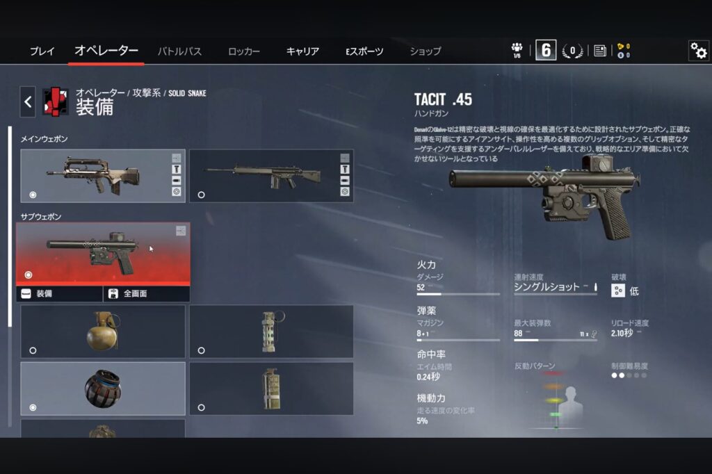 スピード3、体力1の攻撃側オペレーターです。 メインウェポンのF2には新たにグリップを装着することができます。そして、サブウェポンにはスネーク専用武器タシットが登場します。常にサイレンサーが装着されており、隠密性に優れた高威力ピストルです。